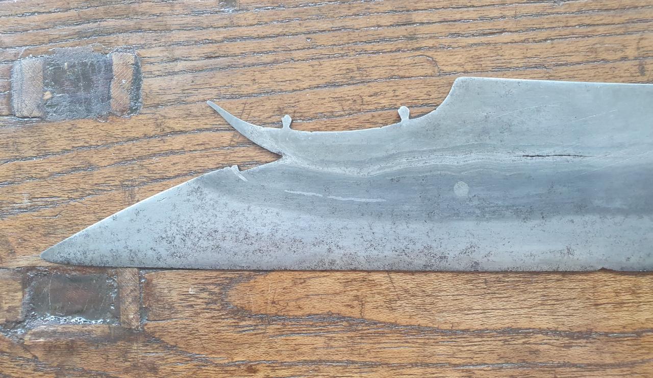 Here is the sundi I was asking about earlier. Note the inset circle below that was revealed by the etch. First I've seen with steel as these inserts are typically brass when they occur. This one would be invisible if not for the etching. Also note the wave pattern and contrast of the etched steel - the sundi looks like a boat on rough water... Attachment 230998 Full sword Attachment 230999 And question. What was likely using the second set of holes on the handle shown here? I'm thinking a second piece of iron but worked with the series of vertical bends we commonly see on kampilan. Attachment 231000 Attachment 231001 Also the complete hilt, note the brass pins that surround the pommel. |