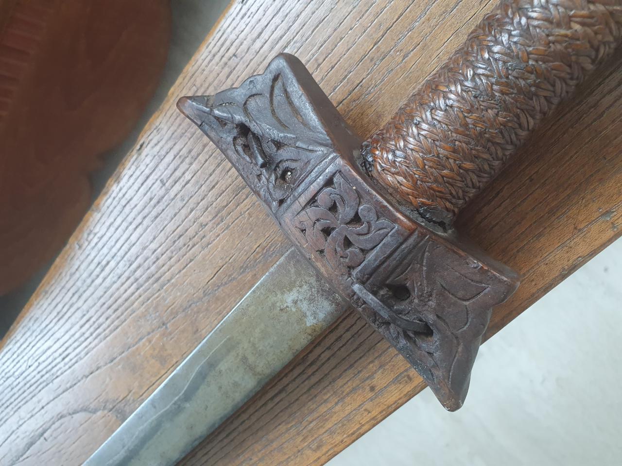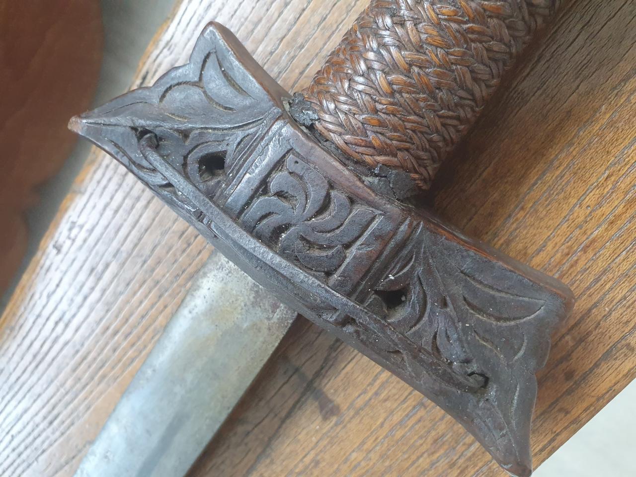 The unusual handle is Banati wood and the cross guard is very hard dark Teak. |