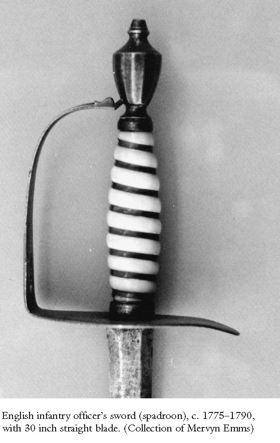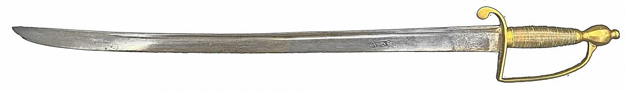 From the illustration, the example you have found is indeed close most notably for the tall urn type pommel, which as in your illustration is faceted. These type of urn type pommels were from the neoclassic fashions and styling of Robert (1718-1792) and James Adam (1732-1794) whose mostly architectural designs (known as Adamesque) became in vogue with popular cut steel small sword hilts of Boulton 1780-90s. These hilts as in the example you show were spadroons, sort of between the small sword (thrust) and heavy broadsword. They were straight blade backswords (single edge) and became regulation infantry officers swords in 1786. ...as noted by werecow previous post (this with brass and 'montmorency' style blade usually used by James Wooley of Birmingham....these I think were naval). I am attaching from "Swords and Blades of the American Revolution" George Neumann, 1973...one of these 'spadroon' typw swords. While of iron, and of course the vestigial langet not congruent, it basically recalls the guard configuration. So the anomaly you have illustrated is a conundrum, as it basically recalls the cast brass hangers of 1742-51 for infantry which were typically made in Germany after their patterns. What is confusing is you note the grip wrap is gone and replaced with copper wire....these hangers were solid cast. Also the pommels were globular, not of this later 'Adam' form which came about in 1780s. We can only surmise this saber is pieced together perhaps with similar type hilt, the 'type' faceted Adamesque pommel, and of course the 'Shotley' blade. Could this be the BTF used by Harvey mid 18th? many of which did not bear his initials. In Neumann (1973) p.67 (18.S), an English hanger with same type blade has the running fox with H in center, shown period 1740-55 p.70, op.cit. (26.S) another hanger 1740-60 with BTF no initial. These hilts are irrelevent as blades are same basically as your illustration. It seems we have agreed that Shotley blades were filtering into Birmingham where many munitions grade arms were being assembled. While the 'fox' seems to have been notably present on many, Samuel Harvey applied his SH initials to many, less with H only and numbers left blank. Oley was the 'ghost' supplier of blades into Birmingham it would seem, and had been for some time as he is not mentioned or noted among recognized English blade makers.That is, until the blade trials of Thomas Gill in 1790s where among blades submitted for tests was Mr. Oley of Newcastle., It seems odd to have such an unusual hilt style, cast and with wrapped grip and later pommel form......though the presence of one of the apparently not uncommon BTF blades which had been coming into Birmingham for some time being used for assembly of an order of such swords. Perhaps surplus blades were used by an unknown cutler who cast hilts for the order ? Colonels of regiments supplied their troops and arms orders were at their whim or design.....even more so with militia units. |