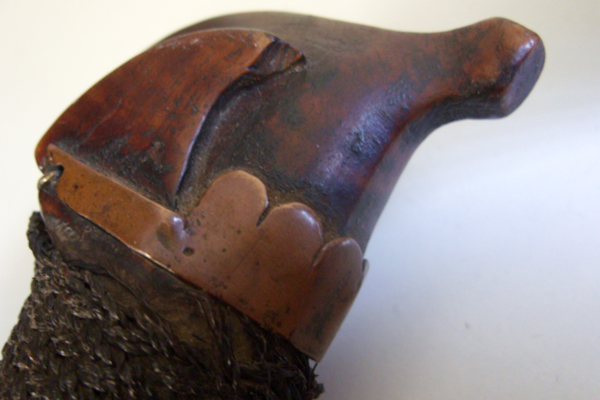 I do have mixed feelings regarding restoring this piece. If the old repair can be shown to be non-genuine, I could well imagine removing all the rattan and fiber, patching the crosspiece and covering all up with a nice band of silver (and also adding another at the foot of the scabbard and possibly a ferrule). If not, I'd prefer to keep it as it is now (except for a silver band at the foot of the scabbard) rather than trying to cover any of the break as well as repair work...
