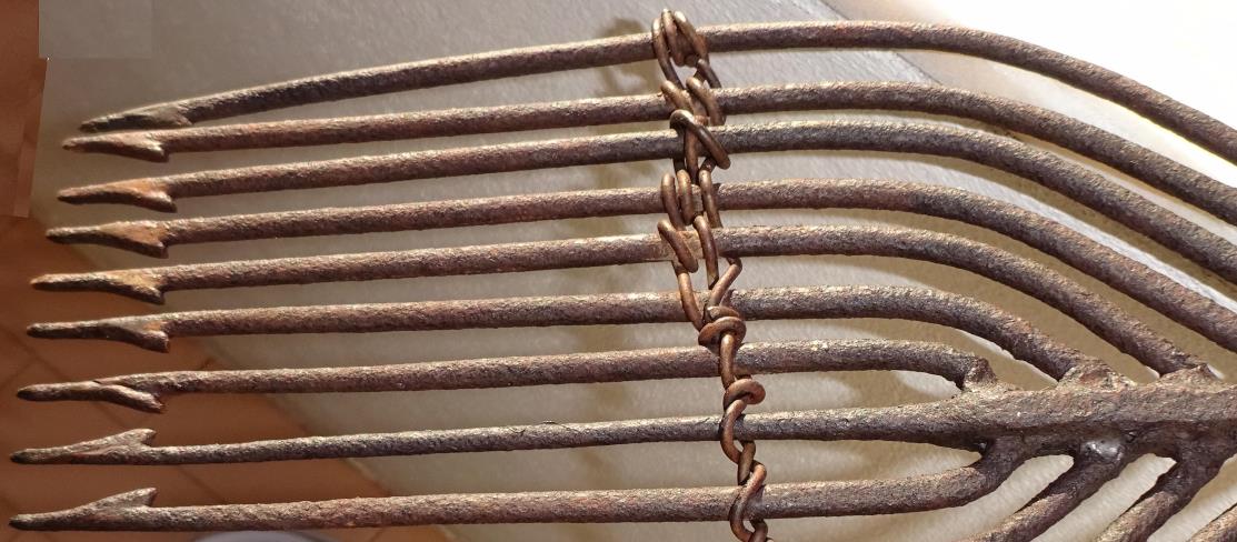 .I still have this intuition that this transverse binding is not adequate to prevent the tines from bending. It is just a thin iron wire (not copper as said), not a solid iron bar. Besides, if this were a patternized implement, would certainly be welded by the smith in a more permanent manner. I am also taking into account its relative position and having just read that "the man must take care to only touch the bed to avoid damaging the prongs". But thinking twice, i will not play the hard head and am ready grant a tie .. |