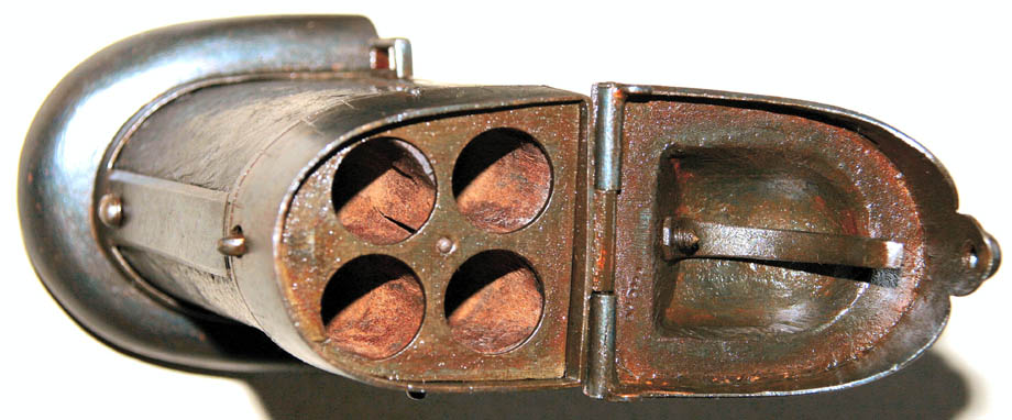 They all consist of a wooden body drilled out for 4-7 paper cartridges and set into an iron frame which, in some cases, covers the wooden core completely. The lid is spring loaded and there are a few iron loops for leather straps to carry the patron. The catridges were stored with the balls bound on top. For loading, the patron was grabbed at the ball and drawn out, the ball was bitten off by the musketeer's or harquebusier's teeth, the powder was filled into the barrel, the ball went after it smoothly (as it was usually of smaller caliber than the barrel it rolled down easily) and the paper was crunched up and put down the muzzle. Then the whole load was rammed down the barrel with the ramrod. The usual number of cartridge holes of ca. 4-7 indicates that this was the average number of rounds that 16th century guns could fire before at least the touch hole, and probably the barrel as well, had to be cleaned. There are, however, some patrons known to have received as many as 11 cartdriges. Interesting enough, we do not know of one single contemporary source of illustration of a patron although they are known to have been used together with both pistols and long guns but only for 'military' and semi-military purposes (e.g. by The Royal Saxon Electors' Guardsmen (Trabanten-Leibgarde). The iron frame was mostly blued, on the Brunswick and some Nuremberg patrons it was finely embossed, and on some highly decorated patrons it was etched and the outer side of the wooden core was sometimes inlaid with engraved bone plaques. They matched the guns in style that they were used along with. I attach samples from my collection and from other sources. Michael |