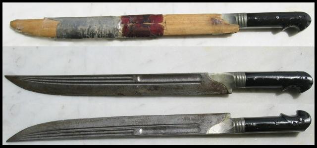 The second I have seen a few of on ebay from time to time,from small knives to short sword sized,this one is 13 1/2 in oa,blade is 9in.Very thin forged blade with engraving and possibly writing on one side.Pommel and guard are horn the handle scales are bone or ivory.Im guessing North Africa on this one.