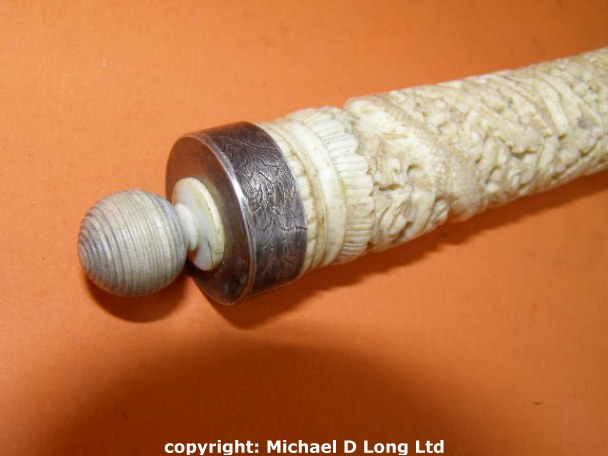 Handle appears carved bone, and could be a parasol handle. The ball at the top, and the way the fittings seem to work well around it and also go with the scabbard might indicate the handle is meant to be what it is? The blade shape reminds me of Iraqi Marsh jambiya, but the scabbard look strikes me as African. Carving could be from anywhere, but has a distinctly Asian or Indonesian look to my eyes. There seems to be an Arabic(?) inscription on the scabbard that might offer clues?