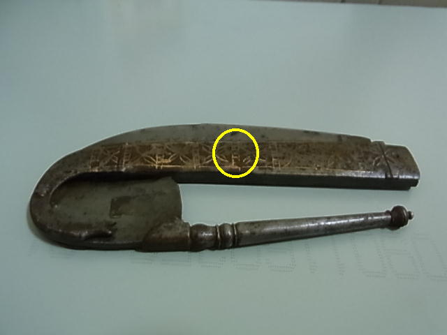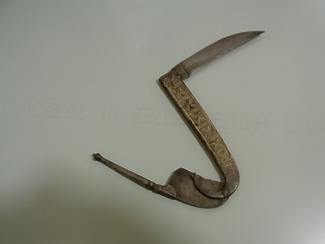It's a folding knife with a guillotine which I believe is for betel nuts. It has white on part of the knife which is typical of betel nut utensils. I've never seen an item quite like this though. It has a fair bit of rust, unfortunately. But its not irredeemable. I'm not sure where it comes from - India, Sri Lanka, Pakistan/Afghanistan are the most likely candidates. In some ways it reminds me of a Lohar pick from Afghanistan. But that may be entirely coincidental. The blade has two resting points – at a 90 degree angle, and straight at 180 degrees. Does anybody have more of a clue as to where it hails from? |