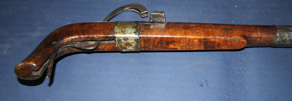 The gun with the slightly longer, more curved buttstock appears to be a widely-used pattern that seems to have been in use from the end of the 18th cent. through at least the mid 19th. I have a slightly better-finished example whose barrel, although with moderate rusting and dark patina, shows a twist-forged construction (unfortunately it has no military markings). The example posted on this thread has seen some hard use, two of the barrel bands are missing and the swiveling pan-cover is likewise gone.