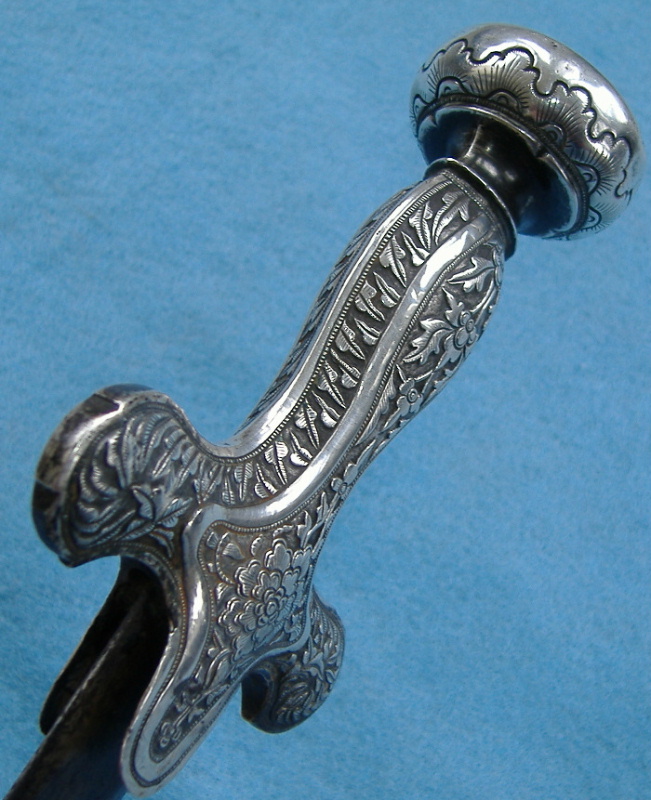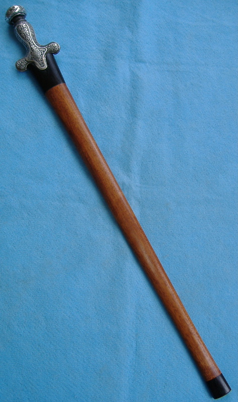 The most impressive aspect of the sword is its lovely hilt of finely worked silver(not white metal, or 'German silver') in great detail which is rather unusual for a piso podang. The pommel bulb is empty with no central stem as often seen on brass hilts. One has to think this is certainly a status piece as it has very little combat value. The scabbard is new. Thoughts and comments are welcomed. |