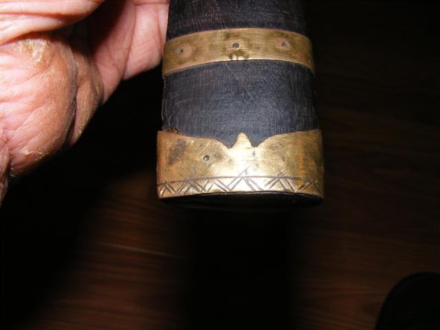 The dagger arrived today so here are a few pictures. The hilt material does not look like the water buffalo horn that I am used to seeing. There are a couple of pictures of the blade where I tried to show the pattern in the steel that did not turn out very well but will still give an idea of what it looks like. There are also a couple pf pictures that show the decorations on the top and bottom scabbard bands. I hope that these might help in placing where this dagger originated. Thank you all for your help so far and I am looking forward to any other comments anyone would like to offer.