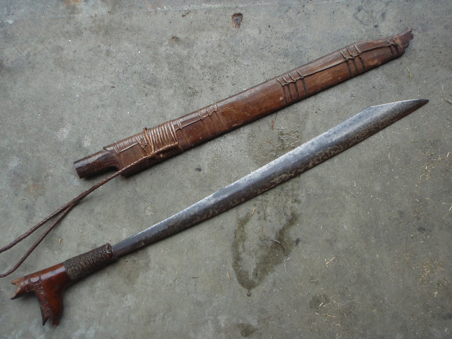 IT LOOKS LIKE A GOOD WORKING EXAMPLE MADE FOR THE LOCALS NOT FOR TOURISTS. SARAWAK IS A GOOD POSIBILITY AS MOST TRADE GOES THRU KUCHING AND HAS FOR A VERY LONG TIME. PARANG ILANG OR MANDAU WOULD MOST LIKELY APPLY TO YOUR EXAMPLE. THAT HAS BEEN THE TWO NAMES I HAVE CALLED EVERYTHING FOR YEARS BUT HAVE LEARNED ON THE FORUM FROM THOSE WHO SPECIALIZE IN COLLECTING DAYAK THERE ARE MANY MORE FORMS AND NAMES. A GOOD CLOSE UP OF THE HANDLE CARVING AND WRAPPED GRIP WILL HELP THOSE WITH THE KNOWLEGE TO HELP THEM GIVE YOU MORE INFORMATION AND APPROX AGE. |