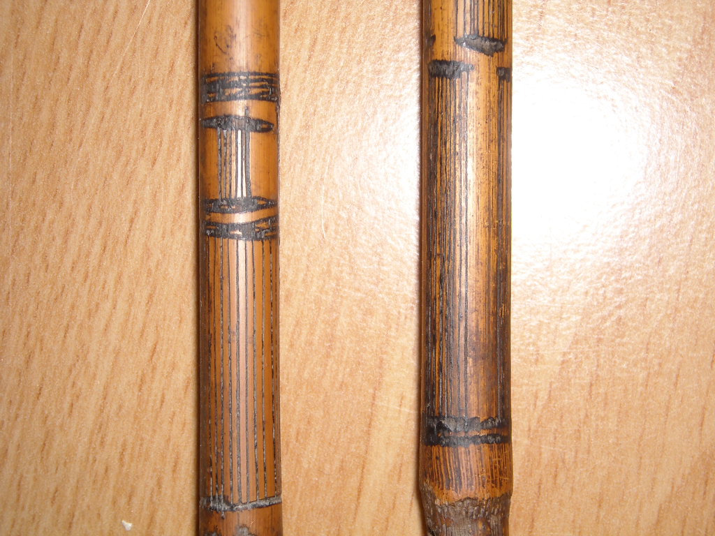 The arrows are bamboo with some carvings on it and palmwood tips. 120-135 cm.