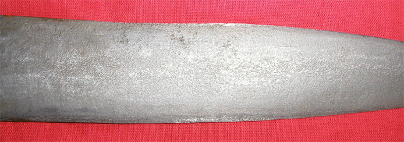 There is some brown rust that may be needs cleaning. There is also some very interesting pattern on the metal. I don't specialize in patterns, which is the world on its own, but it well may be that this guy is differentially heat treated or something else. On the other hand I don't know if it is a good thing to clean it with FeCl. |