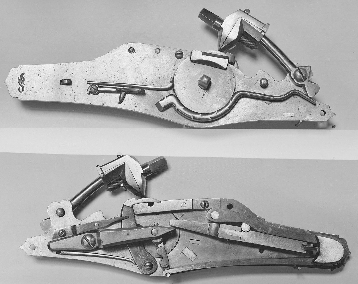E.g., please cf. the locks of the earliest datable wheellock/crossbow combination in the Bavarian National Museum Munich, ca. 1521-26 (my personal guess is ca. 1525+, and I have handled it several times, alas without being allowed to take the lock out), and the earliest dated wheellocks in existence, a small Augsburg Marquardt arquebus of Charles V d. 1530, and another, very finely executed, of identical provenance and dated 1531, plus a completely different combined wheellock and snap-tinderlock Munich arquebus in the Liège Musée de l'Armée, dated 1532, the etching by Ambrosius Gemlich, plus an early-1530's wheellock gun in the Royal Armouries Leeds and some detached mechanisms in the Dresden Armory.