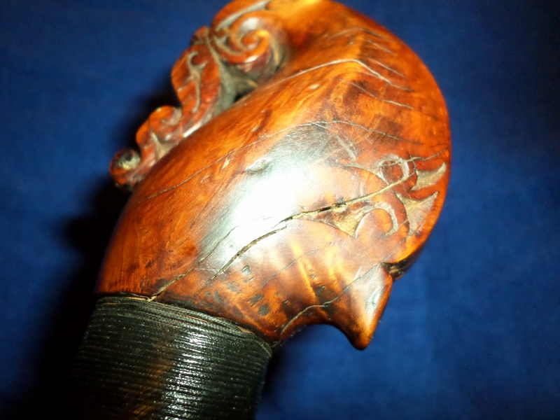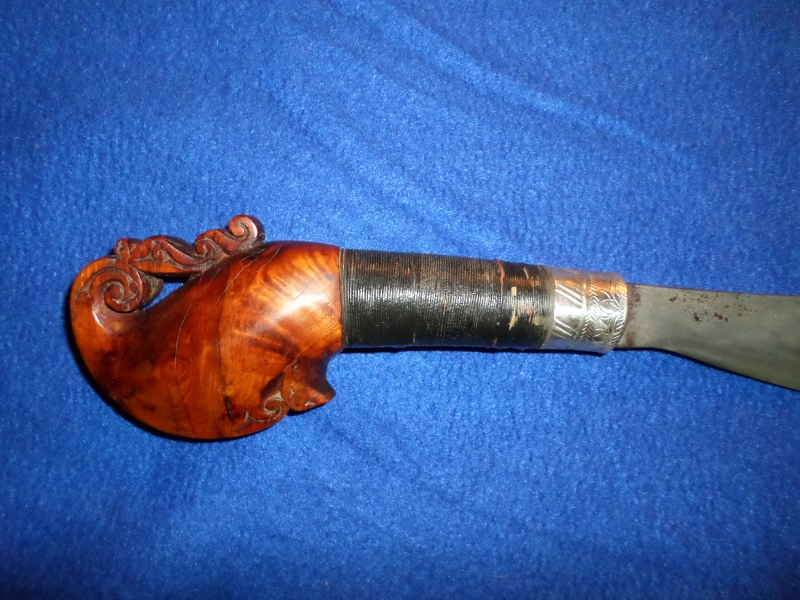 Here is a pira blade with a different type of pommel. 17 inch laminated blade, 23 inches overall. Pommel looks to be a very stylized cockatoo type made of bunti wood. No scabbard. silver ferrule with some engraving. Only pira that I have seen with this kind of handle..........Dave.