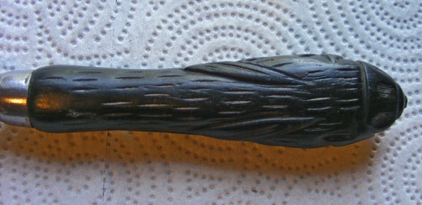 Hello Ken and thank you for your interest and reply. The wood is an extremely hard variety and I imagine would not be very easily carved. Do you recognize the carving as being of an Irish or Scottish form? I will add a few more photos showing the carving at the end of the hilt a bit better.