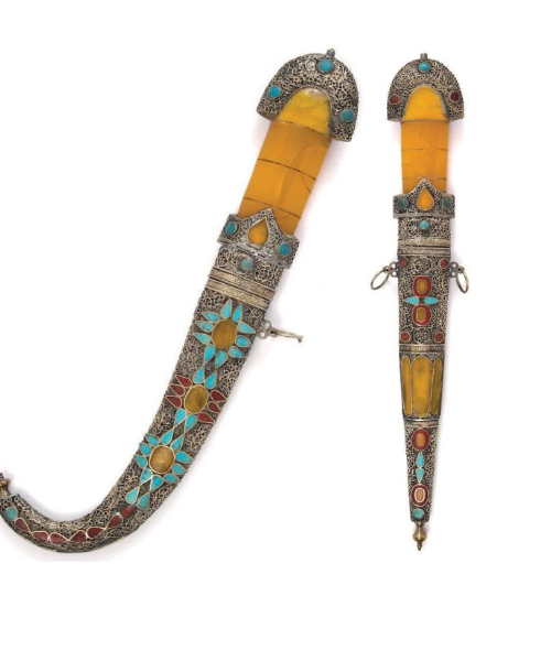 Nice knife, thanks for sharing it with us. I have no doubt that it is a Koummya but I have not seen one before so heavily decorated with jewels and I tend to agree with Kubur that it has been made for someone for special occasions. If you look at page 33 of `Islamic Weapons Maghrib to Moghul` you will see similar decoration on Janwi and Nimcha. Best wishes Miguel |