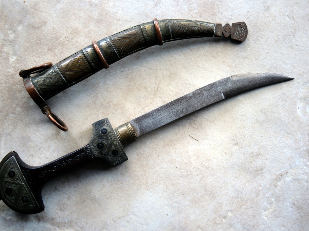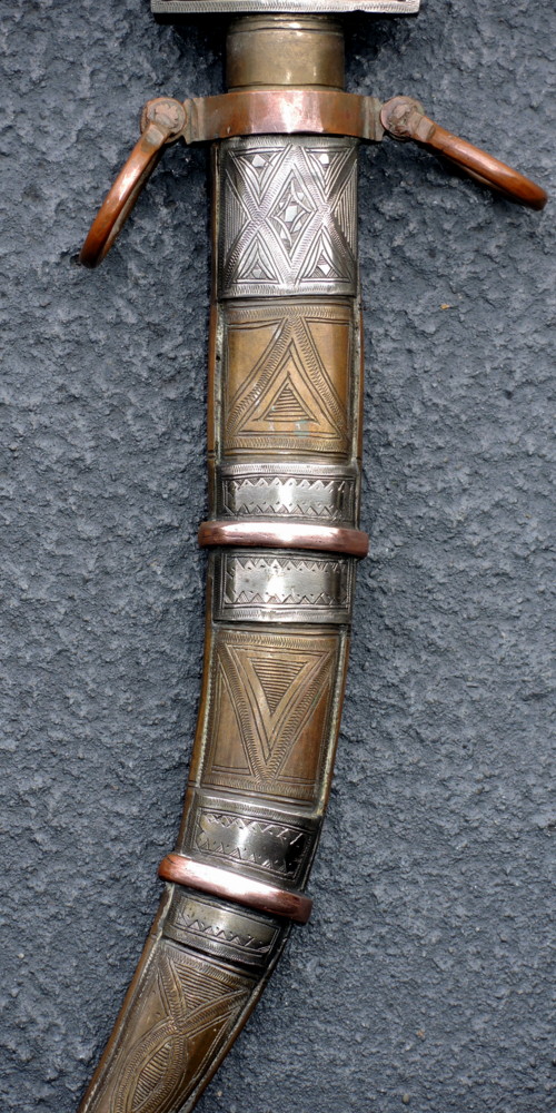 The fittings and scabbard are a mixture of Silver, Copper and Brass with nice quality decoration overall. The handle which I think is probably teak, is nicely inlaid with silver wire, and has two very nicely worked silver plates on the face. The quality forged blade, although typical of the Koummya style, is not sharpened as far up as usual. The scabbard tip also is not turned up as much is as usual with Koummya. Again I feel that there is Tuareg influence at play here judging by the decoration of the scabbard. Opinion and comments please. Stu |