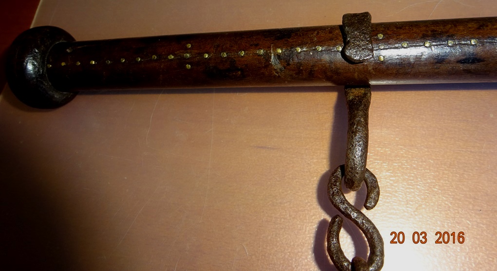 The structure in which both suspension hooks hang is rather peculiar ... to me, for one. 19th century, i would say; not newer than that, for sure. The seller bought it in a street fair in Silleda, Spain (Galicia). Total length 51 centimeters. Have you guys seen similar examples ? . |