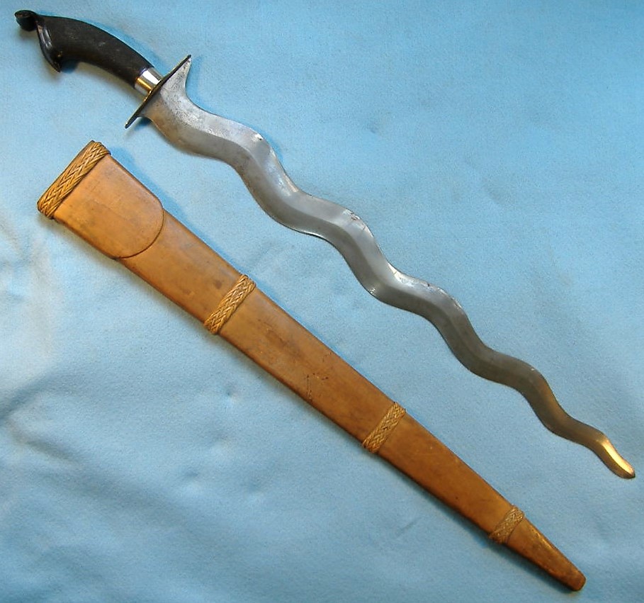 This sword seems to have a little touch of something for everyone...a kriss style blade, a horn hilt that has hints of a barong hilt with a touch of European flavor, an unusual guard with real silver bolster, an engraved floral motif at the forte, and an all wood scabbard carved in the Visayan style!