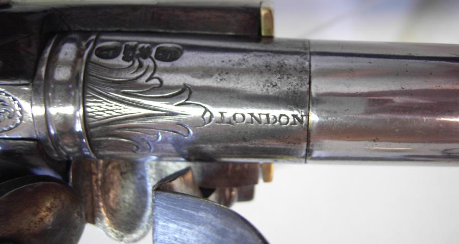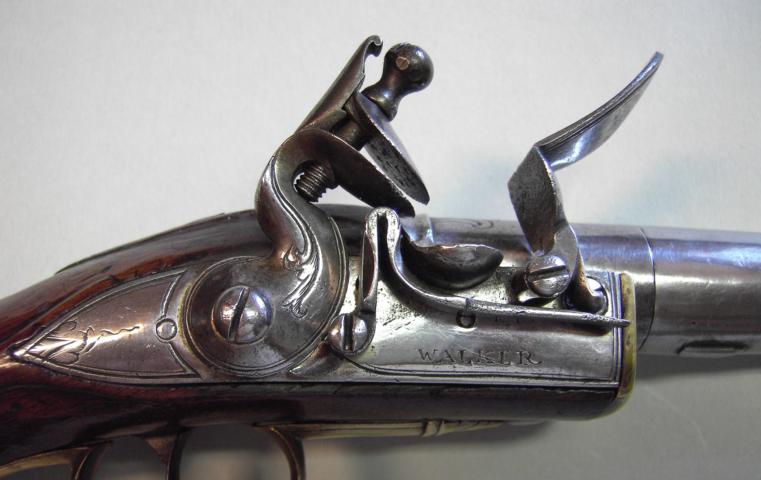 This "truncated" pistol with brass mountings was made by the London gunmaker John WALKER. It has a very bulbous butt and a simply kept muzzle ring without decoration, both characteristics of an early production at the beginning of the 18th century.