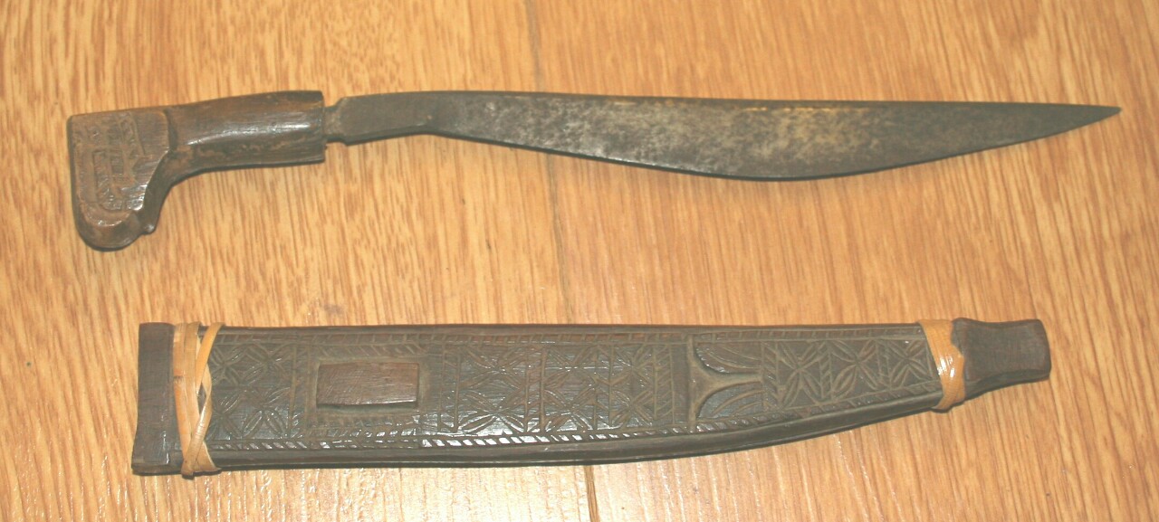 The 1st knife is one of my favorites, but I don't know it's country of origin. It has a wire wrap and metal cap hilt and a scabbard covered in some kind of skin. The 2nd I know even less about. Any information is greatly appreciated. |