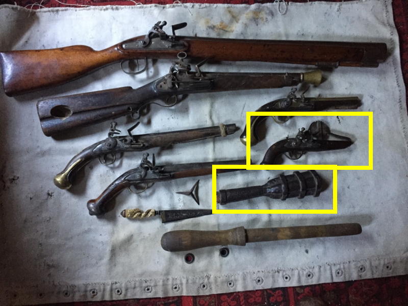 Ahhh, old Caribbean cuphilt rapier, a main gauche, early plug bayonets, a nice early spike ax with brass tack haft, and who can miss the grenado in the corner!