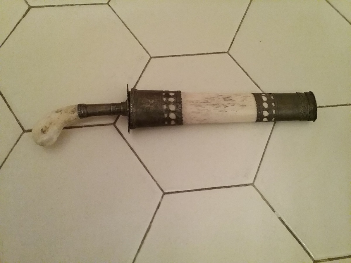 Here is my first gunong. I was attracted to the presence of silver (a jeweler says it is silver, at least). I have looked around, and only have seen one with a similar bone hilt and scabbard. That said, the use of bone for these parts of the knife seems gimmicky, and suggests ethnographic art intended for tourists.