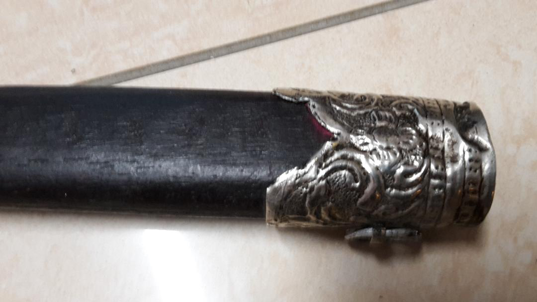 I got this asian dha, I think it comes from Burma or Thailand but I wonder about the handle. made of silver ? The same with the blade ? Recent copy or can it be an old one ? ( I found on the net informations about dha blades with this pattern but the rest seems antique too, here, the wooden scabbard and the fittings seems really recent...) What do you think ? Thank you |