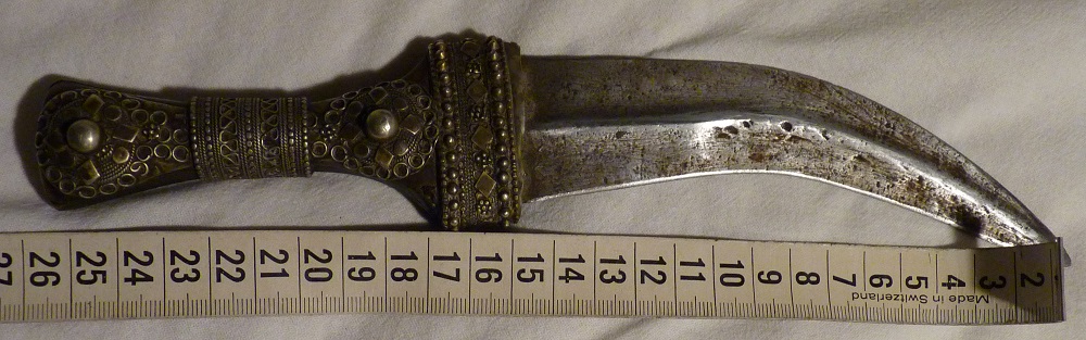 I bought a lot with two jambiyas at auction. I really like the large one and bought it as a wall hanger in my study. From what I can gather the large one is Saudi from the first half of the 20th century and the small one is from Yemen and about the same age.