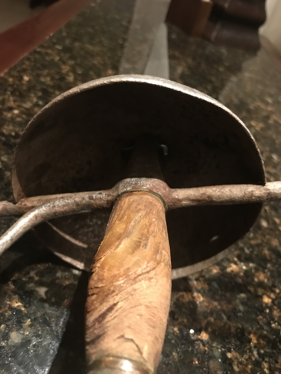 Samuel, Im glad you posted this and gave us the opportunity to discuss it here. Thank you for the kind note, and Fernando and I have been 'at the fence' (study of cuphilts, not the back yard conversation......touche'!! for about 20+ years now.....so really appreciate this. While this is clearly a composite, it is reworked with genuine components being used...and these colonial cuphilts themselves are extremely rare. What you have is actually an item with great history in the components which have continued in an extended history of some sort beyond the working life of the original/host weapon. |