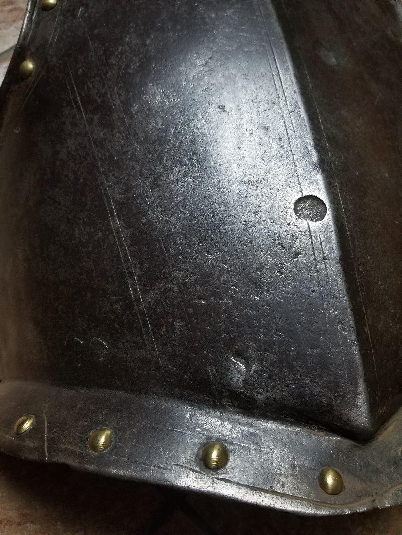 this armor is obviously from a high ranked officer and more decorated , but if you look closely it has also brass decoration on the sides , decorated with similar lines across the torso and even a resembling shape. It is in Musee de L'armee in Paris and is described as " armor for the siege circa 1670" if you look closely you can see that this helmet has also reinforcement plates on top. I wonder if the two bolts on the breastplate are used to attach extra reinforcement plates to, this method was used at the time on both helmets and breastplates. This closed helmet for the field circa 1620 with bolt on ( removable) reinforcement plates is in the Metmuseum weight 6,293 kilo.