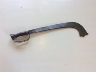 Kora with thick beefy blade with a kukri style handle and simple guard. It measures 30 3/4" when measured in a straight line from the top of the handle to the tip of the blade. Asking $725. Please e-mail with any questions.