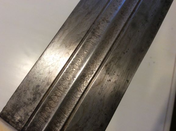 Being offered is a Qama with twistcore central panel and laminated edges. Missing one rivet to the handle. Blade has some nicks along the edge and the very tip is squared off. Lots of pictures of the center twistcore panel. Forged, not etched. Measures 19 1/4" overall and blade is 2" wide at forte. Asking $1200 or open to trades. PM or e-mail me.