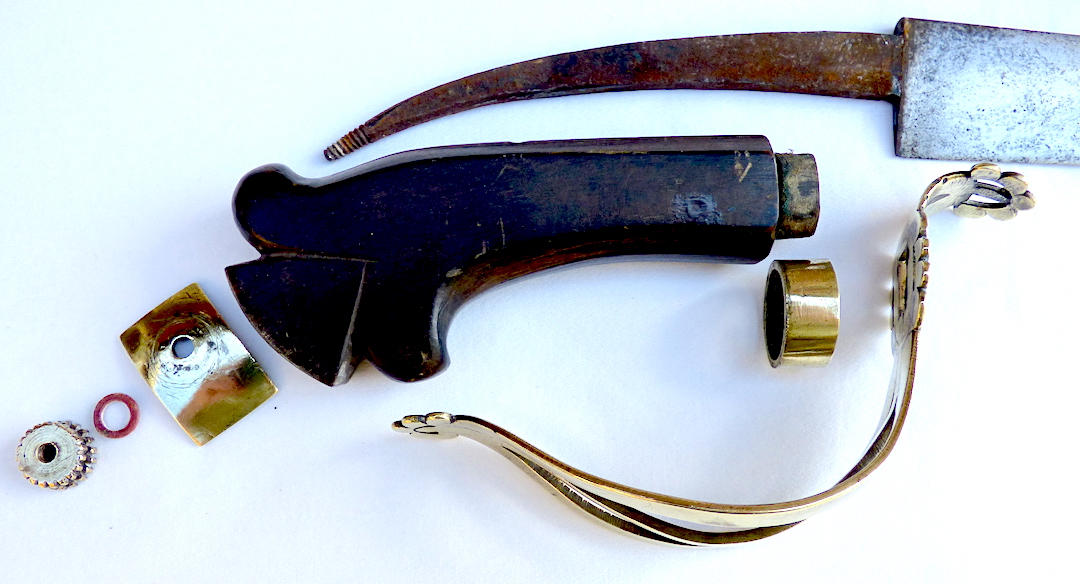 The swords were obviously influenced by European sword design, especially with regard to the threaded tang construction, brass guards, and leather sheaths.