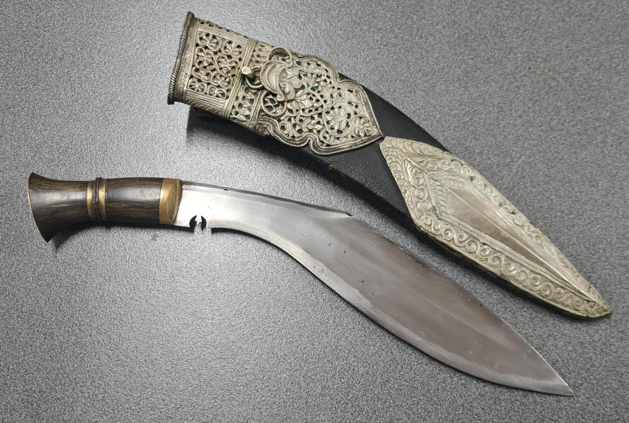 okay clever chaps, i normally only purchase military kukri but the blade on this while of standard proportions is quite light and elegant. Horn and plain brass handl