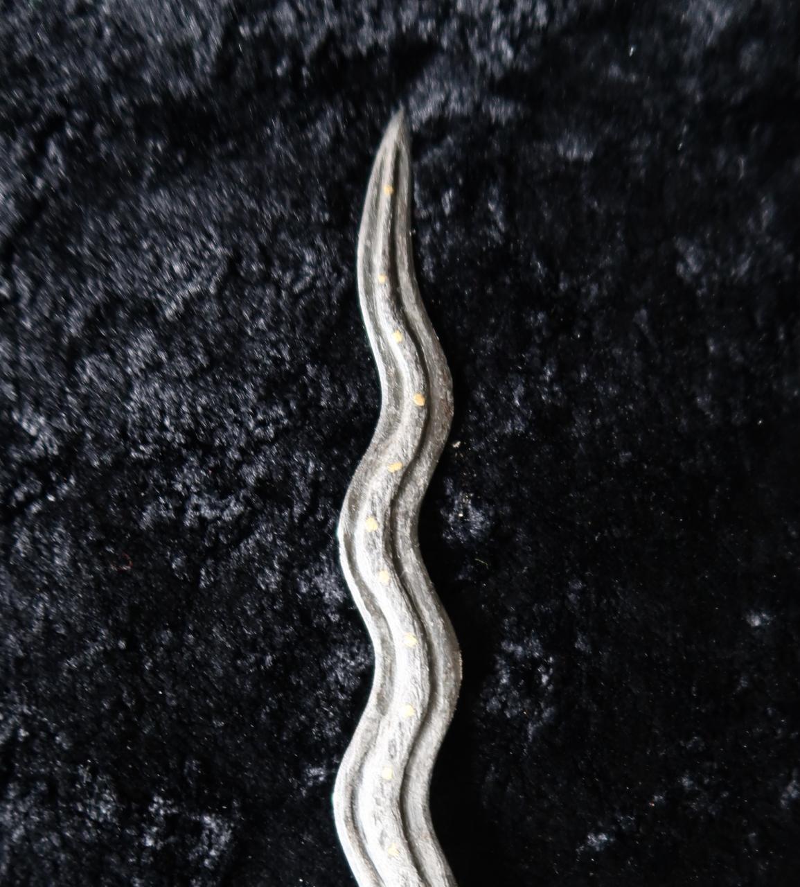 I bought several items at an auction in the Netherlands a golok, a Keris Yogyakarta Gayaman and a Tombak with sheath the tombak shows pamor And a nice 19th/ early 20th Century Keris with a Warangka Gayaman (Kayu Pelet), Ivory Madura Ukiran. Silvered Selut with stones. The Wilah inlaid with dots and carved with a Naga and 11 Luk. A silvered pendok that needs restoration. I already restored the mendak as it fell apart so I made a new inner sleeve where all the parts slide over and hammered it carefully together again. I am not sure if the inlay is gold but it looks like it. Hope to learn more about this Keris through the forum. Thanks and best wishes, Martin. |