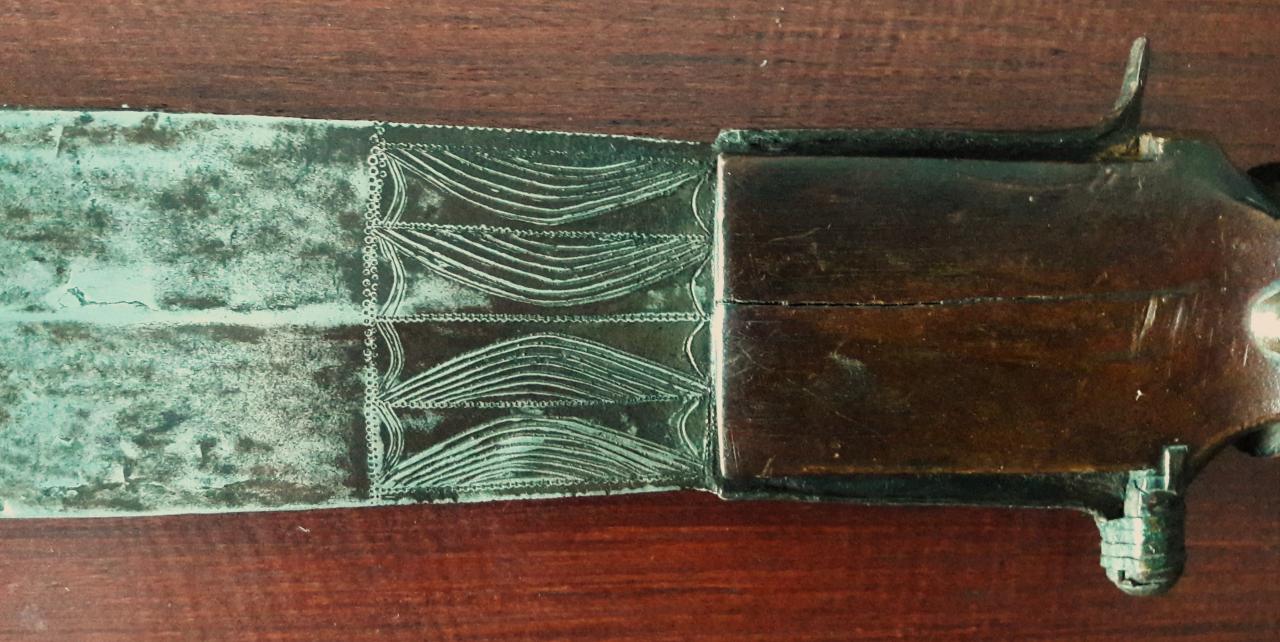 My most recent purchases, two swords of the fang.Their territory spans South Cameroon, Equatorial Guinea, Gabon and Congo. The specimen with the scabbard is 56.3cm and 62.1cm scabbard included. Both blades are quite thin, The one with the scabbard is 5mm thick at the hilt and 1.3 at the tip. The scabbard is missing a piece at the bottom, no idea if the scabbard was once covered with reptile skin or brass, no remnants to be seen. Both blades have a full length central rib. The specimen without sheath differs in blade shape.The most common shape is like the specimen with sheath, the typical wings or barbs. According to the site africanarms.com, the form without these barbs is older and rarer. My specimen is 53.6cm long and 3.7mm thick at the handle and 1.5 at the tip. These two Fang swords are the first I have held in my hands so I have no comparison in terms of blade thickness. There are plenty of specimens on the net and in the books I have with more massive blades and the thinner ones. I wonder, knowing that African blades were often thin in the period before they were overrun by imported European iron, if the thinner ones are older than the thicker ones or if they coexisted. Given the patina on the handles, they appear to be of reasonable age. Comments welcome. Best regards Marc |