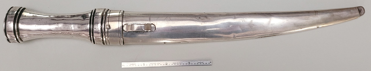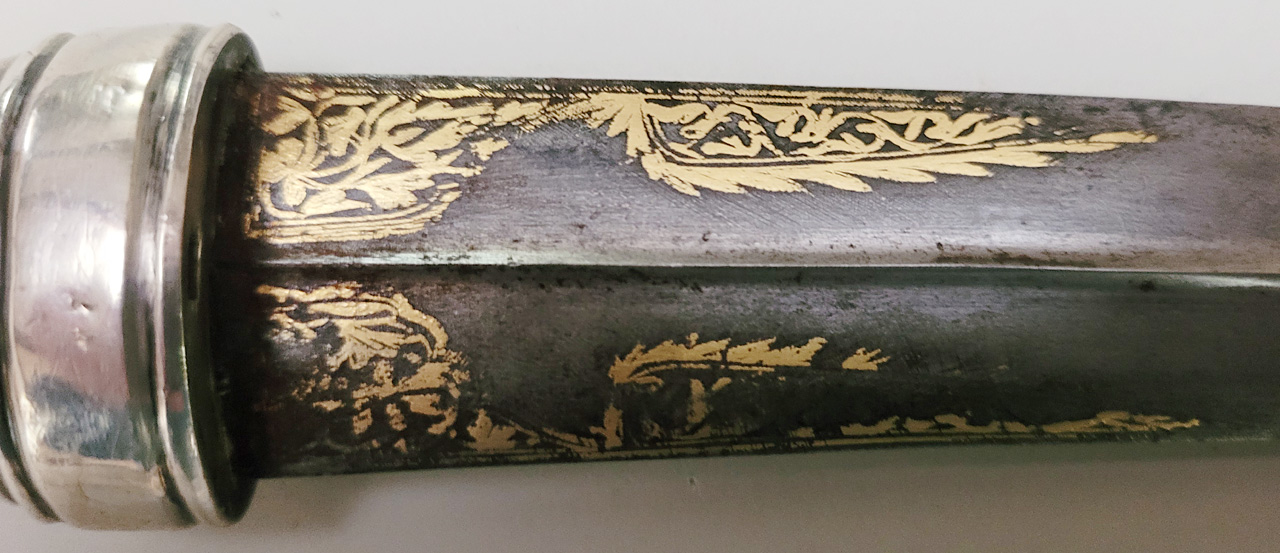 The mounts are good solid silver with some rubbed hallmarks of European appearance - hopefully someone here will recognize them. I have the sense that this was mounted for "concealed carry." The sheath and hilt have a simple locking mechanism and a small pin must be pressed on both sides to unsheath the blade. It appears that a loop on the opposite side of the sheath has been lost.