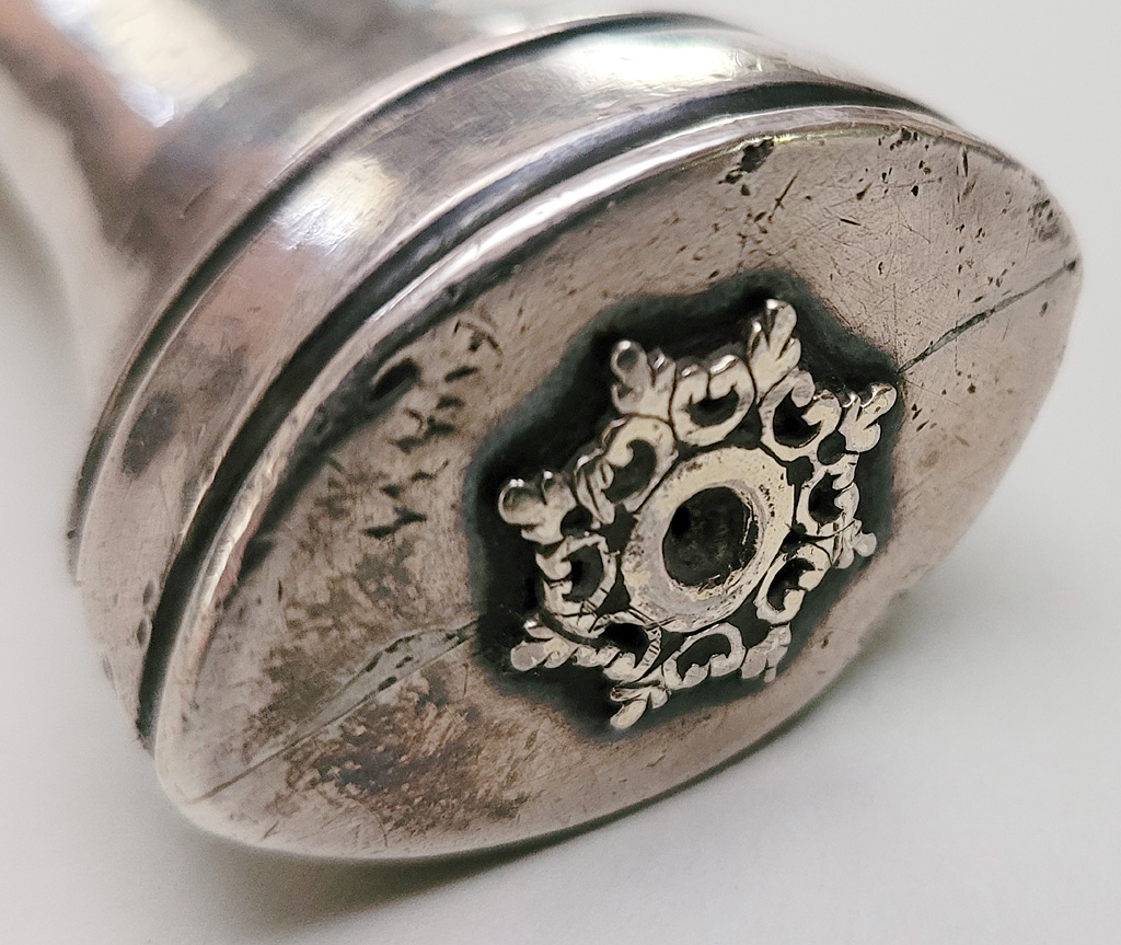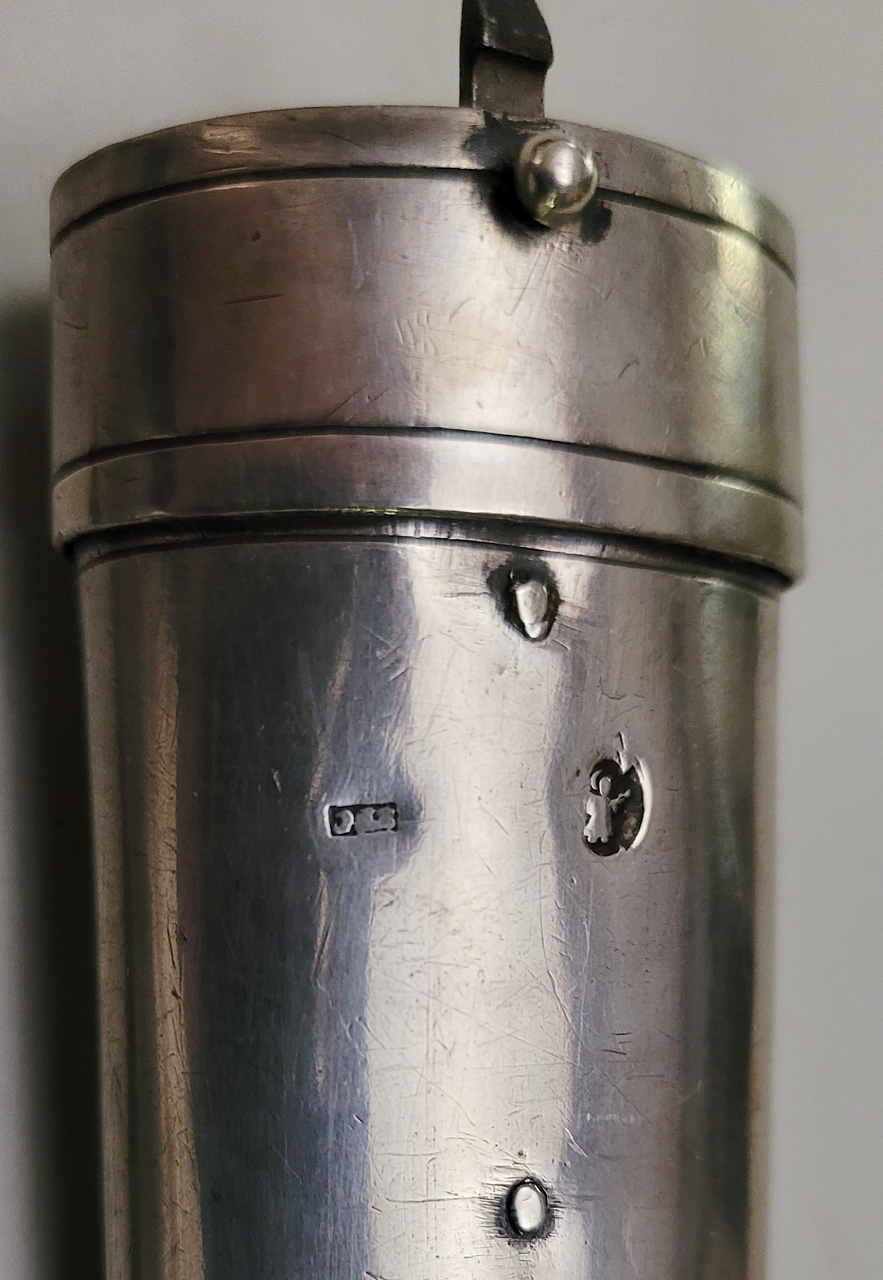 A current thread about stories accompanying items from dealers brought to mind that when I bought this, decades ago, I was told the marks were Bavarian import marks. Sure enough, following several internet searches I find the larger of the two marks is a variation on the Munich coat of arms (better with a jeweler's loupe than any photo I can capture) and would be used with another mark for origin on an imported silver item before 1886. Probably an interesting story there, definitely now lost.