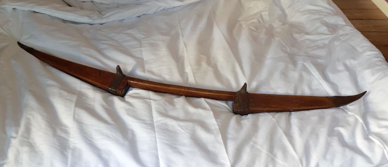 A wooden object, about 1.5 meters long, slightly curved with pointed ends and a rectangular cutout in the middle.
