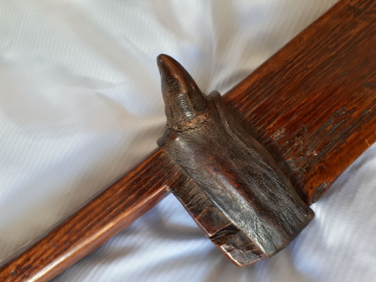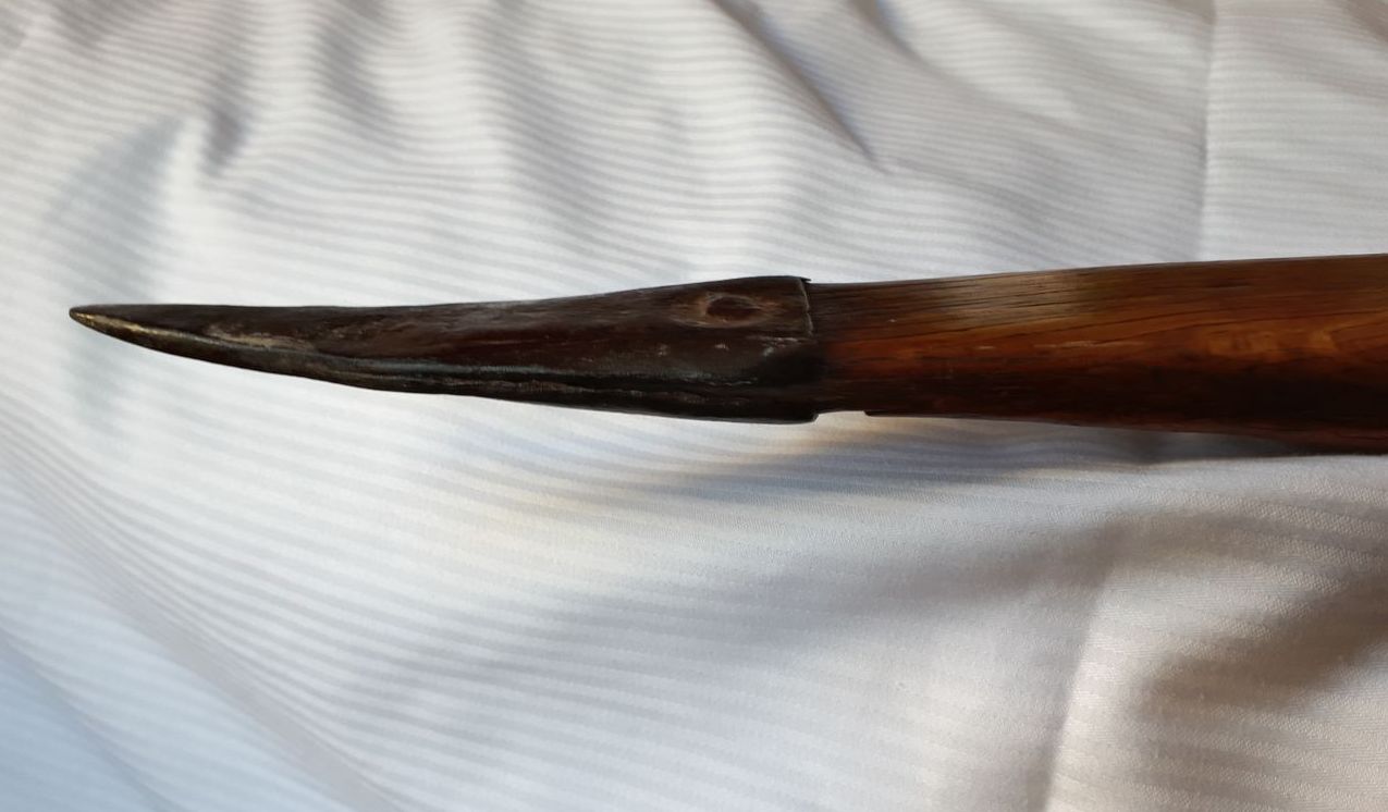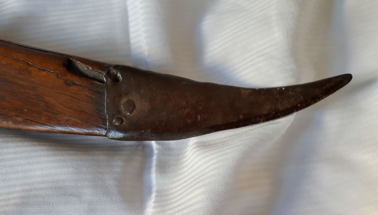 The points are capped with iron, and to the right and left of the cutout are two horn spikes, attached with leather.