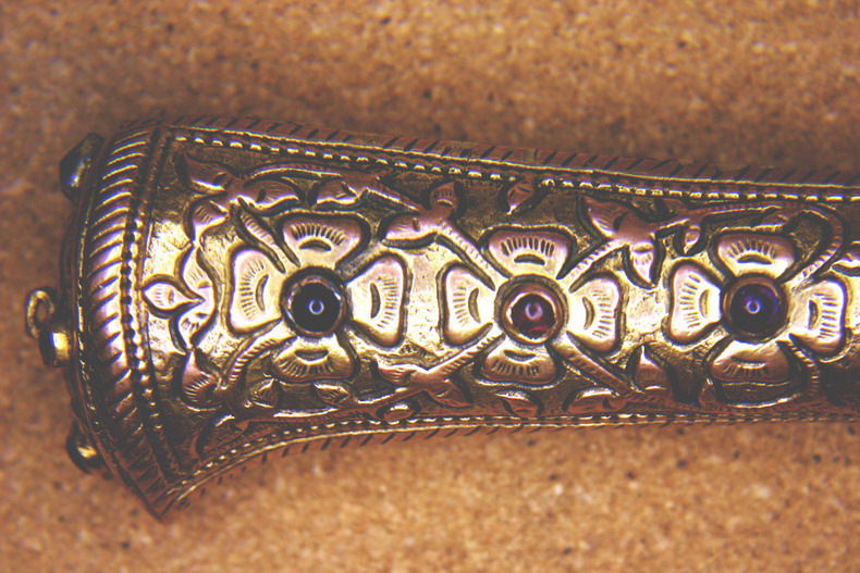 Decoration on Indian hilts have been made in many different ways like, cut in relief, cut in relief and gilded, true damascening (inlay), false damascening (koftgari), gilded and the design removed to be seen in negative, inlaid with stones, enamel and stones and enamel. There are other kinds of decorations, just as there are different kinds of koftgari and four or five different ways to make enamel.