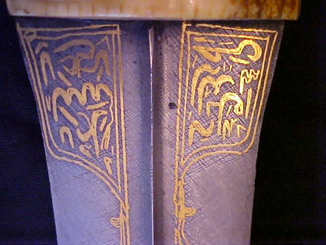 Where the crossguard would normally be the steel is formed into a rather complicated octagonal segment about an inch in diameter and is one piece with the blade. The fluting is decorated(as is the top of the blade and two crescent shaped pieces one on either side of the blade)with what appears to be a silver wire inlay.
