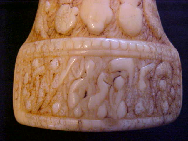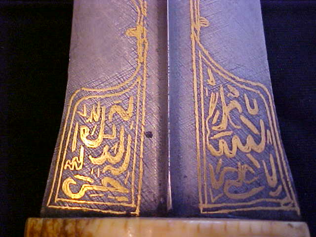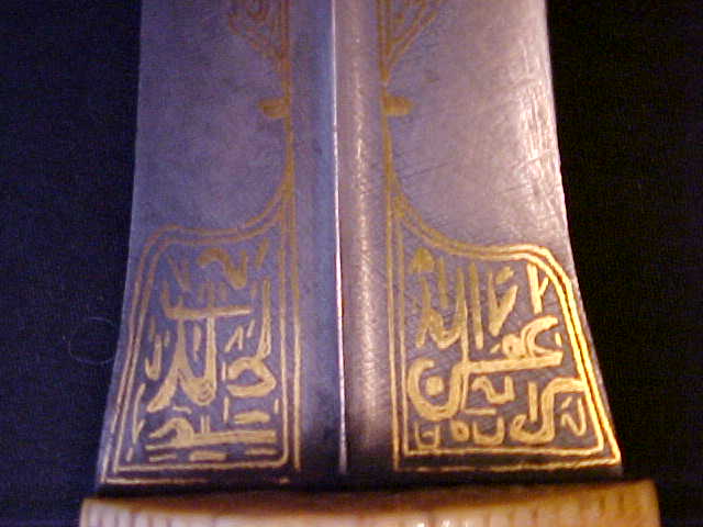 The second item is a jambiya that was a gift to me about 25 years ago.It came wrapped in a brown paper bag that had deteriorated horribly(it spent many years prior in a laundry).What I found to be unusual about it(other than the carved ivory handle,damascus blade with gold inlay work,and the wooden sheath covered in some type of skin resembling lizard)was that it had a companion dagger with it also of damascus with a carved ivory handle.