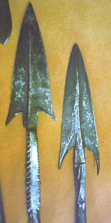 finally, Santa got me something I really wanted (socks are such a bore )6 Spears , 3 seem very similar in construction ( socket arrangement and the shaft) although there are variation in spear head design. 2 of the spears have sockets with a 'triangular addition' ...a feature I have not seen before. One has very short barbs and the other has nice decoration on a rectangular (in cross section) shaft before the spearhead. The last one has a lovely, well crafted socket with a decorated collar ...the blade seems to have laminations ..... The wooden shaft is a totally different species to the others which terminates with a socketted spade end.I am extremely happy with them When I received them they were quite rusty and I have tried not to overclean. I believe that these are quite old, the wood has nice patination and I believe these were stored in a cool, dry environment for some time...so age cracking and warping has not occured. But, some shrinkage of the wood has.Please if you have any ideas as to origins, or any comments at all, I would be most gratefull, thank you Kind Regards David |
