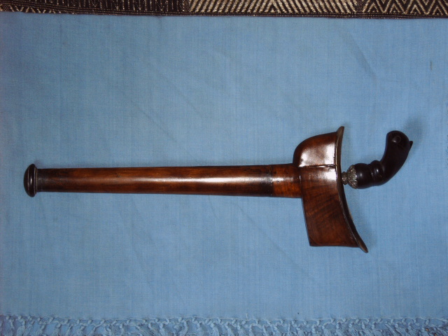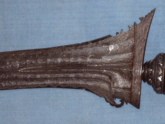 A keris from Sumbawa. The silver fittings with the twisted wire works are typical of the region, but not too gaudy. The hilt too, has motifs quite distinct from the Riau or Sulawesi Bugis. 15-waved blade, which seemed quite common in Sumbawa. Tough blade, with pretty tight adeg like forging lines.