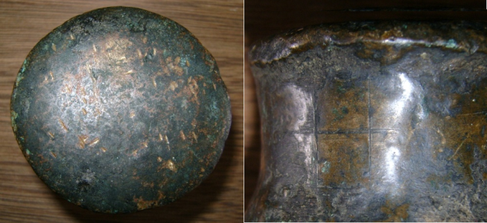 The tiniest barrel i have come across: 7,5 X 7 cms. The bore, showing irregular walls, measures around 30 mm. Forged bronze, with a genuine patina and some slight verdigris spots. It might have been used, judging by the touch-hole imperfections. Seller dated it XVII century. This is possible, but i will submit to better judgements. There are some grid marks on the back of the body. I wonder whether these things were brought over by Spaniards or were actually forged locally. So how should i situate it ... meaning how should i name it; Colonial or Spanish-colonial? Coments will be much welcome . |