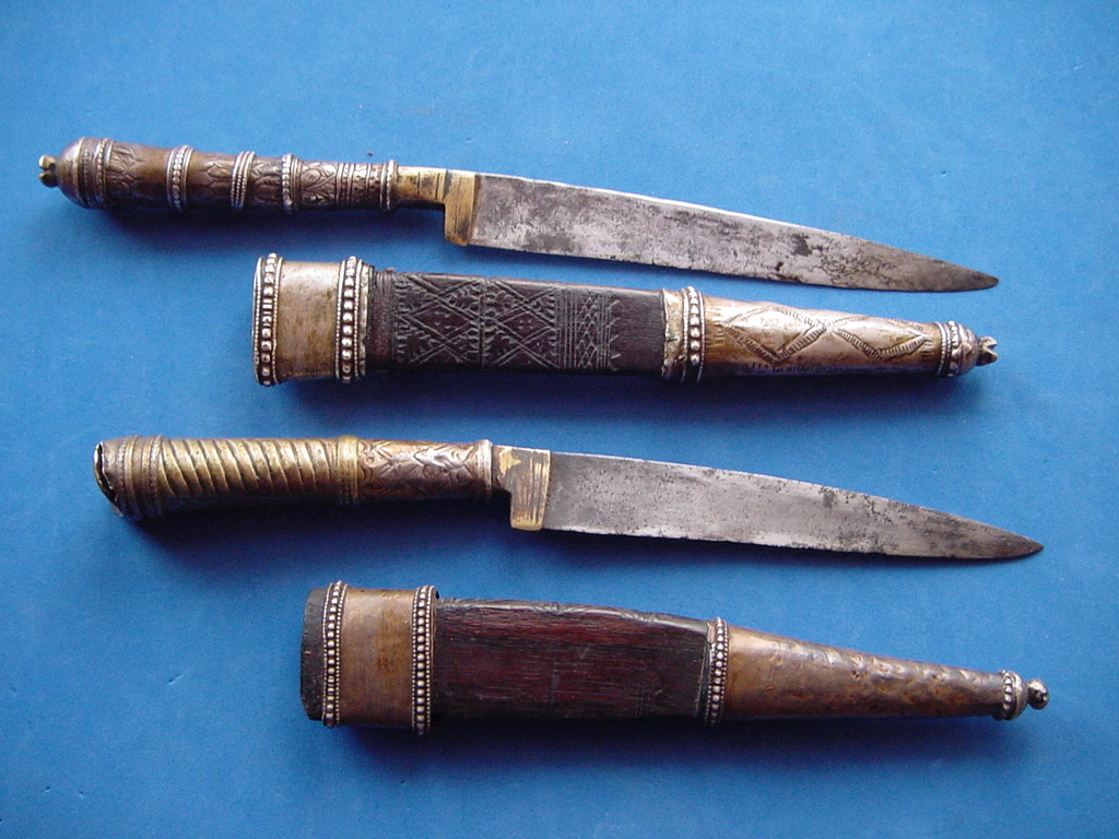 They look like the sheaths mid sections were originally covered in leather. Blades are 5 and 51/2 inches long. The top one in the sheathed photo has an eared balkinlike pommel. Thank you for any information on these two. |