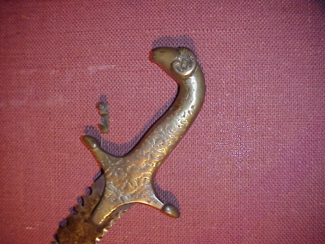 If memory serves me right, there is a senior member on vikingsword who recently posted a picture of a short sword with a similar hilt and an extremly curved blade (no serrations). His was authentic but I cant seem to remember who it was... Let me see if I can find that thread now