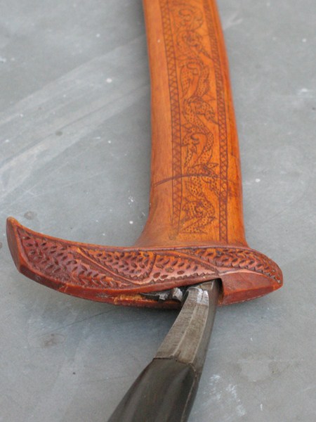 handforged blade, bufallo horn hilt (dark buffalo horn with a greenish glow. Wooden scabbard with nice carvings and with no damage at all. Scabbard is cut from one piece of wood and has a lid on the back to close the scabbard. price Eur 175 + shipping. I may consider a swap for Borneo items. |