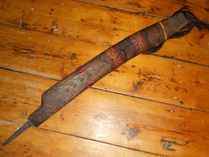 Seems to be an old and authentic piece .. out of my 'heap' so been in my attic for at least 25 years . Blade 59 cm long across the curve , including the tang. Max width of blade 5 cm. No grip and there is a piece of wood missing from the upper back edge of the scabbard ( see pic ) .